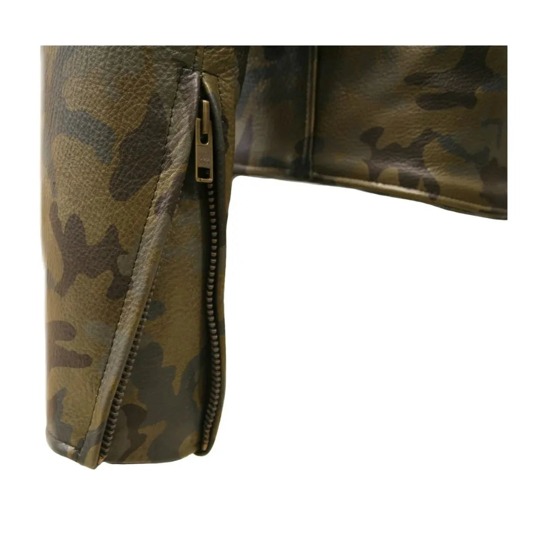 Hillside USA Camouflage All Leather Biker Jacket is a celebration of classic military attire. This crafted jacket is composed of a 1.2- 1.4 full grain cowhide camouflage Leather. Putting camo on leather is no easy task, heat and pressure is used to literally bond the camouflage pattern to the premium leather. The result is a permanent, abrasion resistant bond that will last the life of the product. Features: action back, zippered cuffs, three Cordura lined outside zippered pockets with snap-down collar two internal pistol pockets (approx. 9" deep) which close with a snap on one side and a zipper on the other. Lifetime Guarantee.