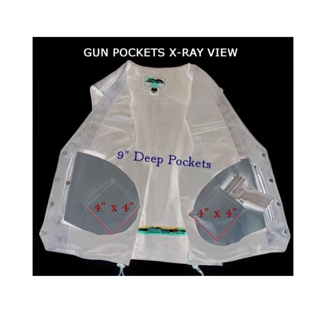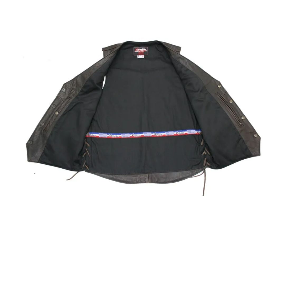 Busting at the seams with style, class and intricate detailing invite all to wear The Cruiser Vest. This sophisticated design provides comfort and protection at the same time with 1.2 -1.4mm (3-3 1/2 oz.) Soft, Supple distress brown Naked Leather. Double sided leather interfacing, enables the vest to retain shape when carrying a concealed pistol or any heavy objects. Two leather-lined front pockets (approx.6''deep) and two inside leather lined pistol pockets (approx. 9 deep) close with a snap on one side and the other with a zipper, both have a small internal pocket (4 x 4) for a gun barrel or cell phone . Adjustable lace-up for just the right fit. Genuine Bison Nickel converted into snaps by USA. Poly Twill extremely durable liner. Comfortable set with elegant Double stitched lines throughout.