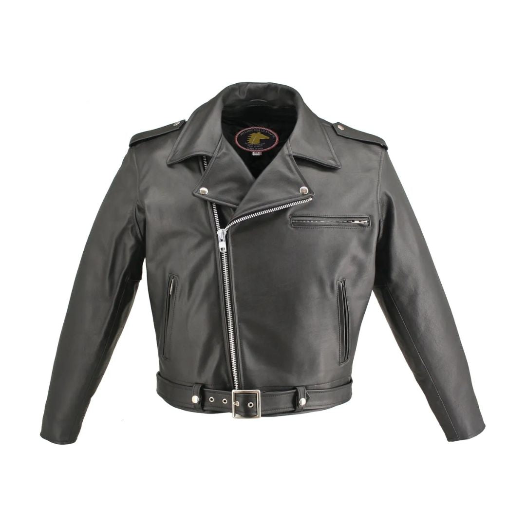Men's Classic Highwayman Horsehide Jacket. We have taken the best elements from the countless jackets that have passed trough our hands over the years. This Jacket is loaded with riding features starting with a unique 1.2-1.4mm Front Quarter Horsehide and the craftsmanship that only HillsideUSA can offer removable Full Sleeve Thinsulate Zip out Liner with knitted cuffs, two hand warmer pockets are leather-lined. Chest zippered leather lined pocket. Two inside Pistol Pockets (approx. 9 deep) close with a snap on one side and the other with a zipper, both have a small internal pocket (4 x 4) for a gun barrel or cell phone, Heavy Poly Twill shell, an extremely durable linnig.YKK silver hardware, hidden snaps that makes it simple, yet functional design. In addition this jacket offers Bi-Swing Back and Vented Underarm Gussets for comfort and range of movement, with belt adjustments to assure right fit for years of comfort and protection, the built-in kidney panel makes it a great riding jacket . Men's Classic Horsehide Motorcycle Jacket. Designed for harsh climates, winter wear this jacket is an understated classic.