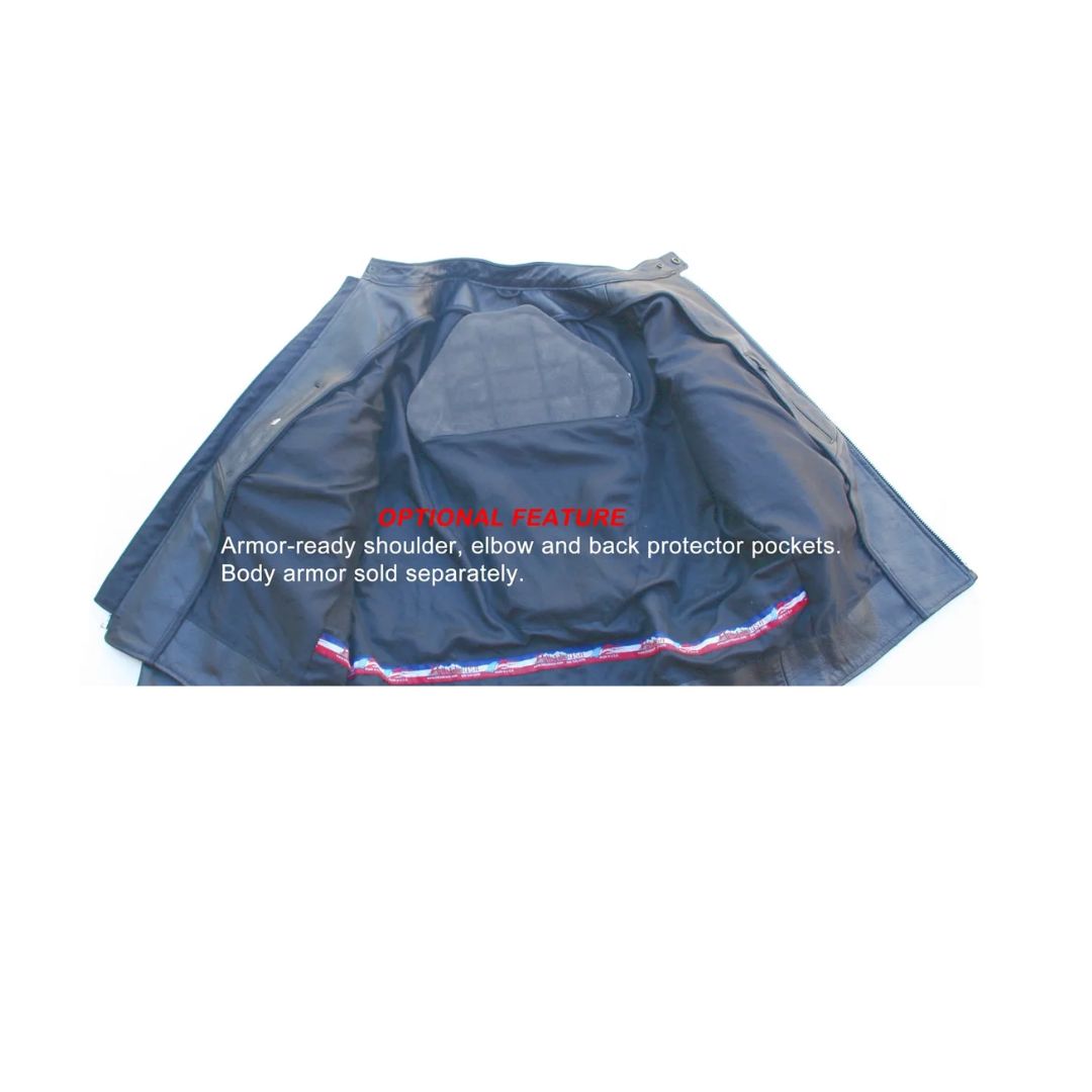 Our D Pocket Motorcycle Jacket Black is one of a kind jacket that, once you've worn it, you can't imagine how you ever got along without it. This jacket build from 4-4 1/2 ounce Soft Premium Cowhide Naked Leather carefully selected , specially tanned , processed to yield the softest, most comfortable and durable leather available. No other leather compares Black Cowhide Naked Leather. Like most jackets designed by Hillside USA features a heavy-duty YKK antique brass zipper in front. Two outside and two sides zippered leather lined pockets. In addition this Jacket offers two inside Leather Lined Gun Pockets, one zippered and the other snapped. It's designed with shoulder expansion joints and vented underarm gussets allowing greater forward arm mobility. The double-thick rear kidney panel provides firm yet comfortable support. A zip out Thinsulate liner provides a warm layer for cold-weather riding. Full removable belt for just the right fit. The D Pocket Biker Jacket has every detail needed for a rider to look after. Optional Feature: Armor-ready shoulder, elbow and back protector pockets. Body armor sold separately Lifetime Guarantee.
