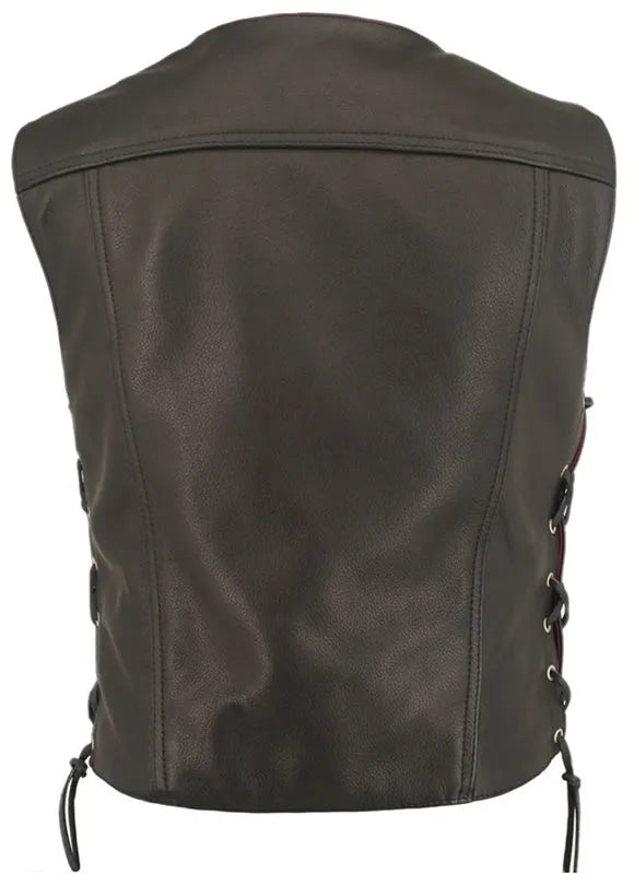 Men's Denim Style Vest Lace Side. Classic high end looks combined with great comfort and value. Multi-panel stitched design. 1.4-1.6mm (3 1/2- 4oz) Soft, Supple Cowhide Naked Leather, and with our standard features: Double sided leather interfacing enables the vest to retain shape when carrying a concealed pistol or any heavy objects. Two leather-lined front pockets , two leather lined hand-warmer pockets and two inside leather lined pistol pockets (approx. 9 deep) close with a snap on one side and the other with a zipper, both have a small internal pocket (4 x 4) for a gun barrel or cell phone. Poly Twill extremely durable liner. A show piece that will never go out of style. Denim Style Biker Vest Lace Side. Lifetime Guarantee.