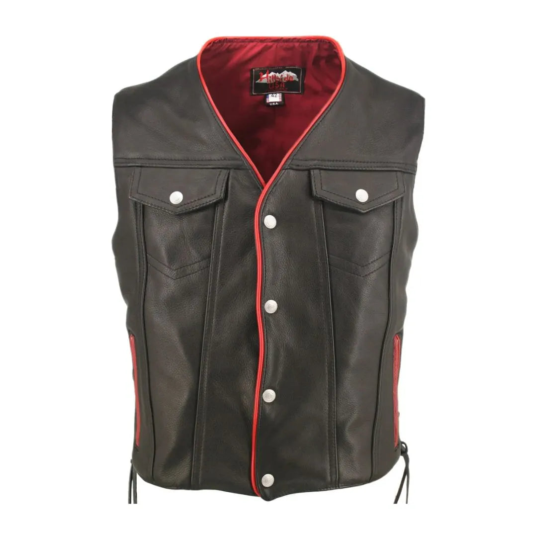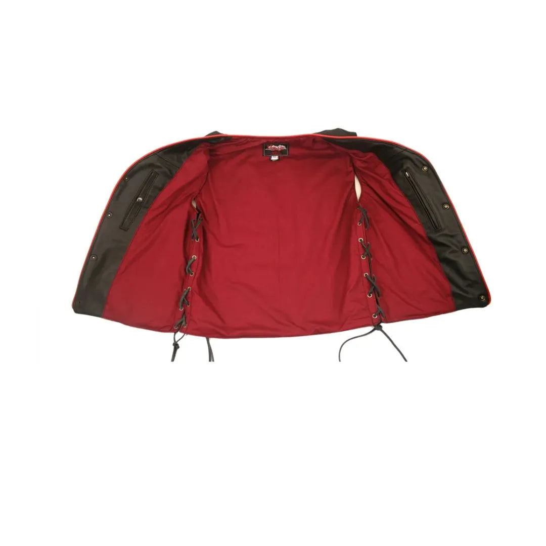 Men's Denim Style Lace Side /Red Trim Leather Vest nowhere else you can find higher quality leather, unique designs and creatively tailored leather apparel than in USA. It all starts with the leather: 1.4-1.6mm (3 1/2- 4oz) soft, supple Cowhide Naked Leather, stylish red piping details, USA's silver snaps closure and creatively tailored this vest looks spectacular. As always, double sided Cordura interfacing enables the vest to retain shape when carrying a concealed pistol or any heavy objects. Two leather lined hand-warmer pockets and two inside leather lined pistol pockets (approx. 9 deep) close with a snap on one side and the other with a zipper, both have a small internal pocket (4 x 4) for a gun barrel or cell phone. poly twill extremely durable liner. The Men's Denim Style Lace Side /Red Trim Leather Vest is truly a perfect blend of ruggedness and innovation proudly made in the USA. Lifetime Guarantee.