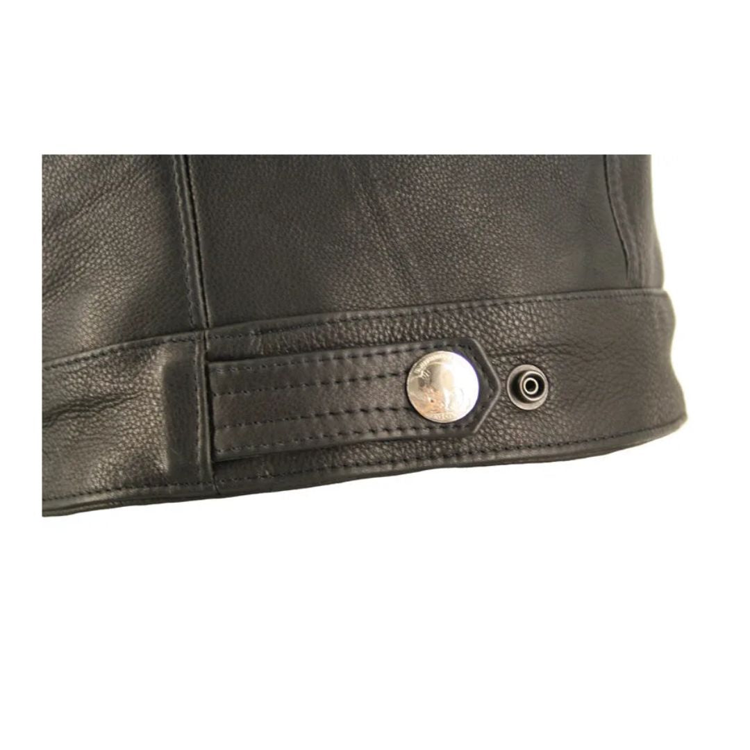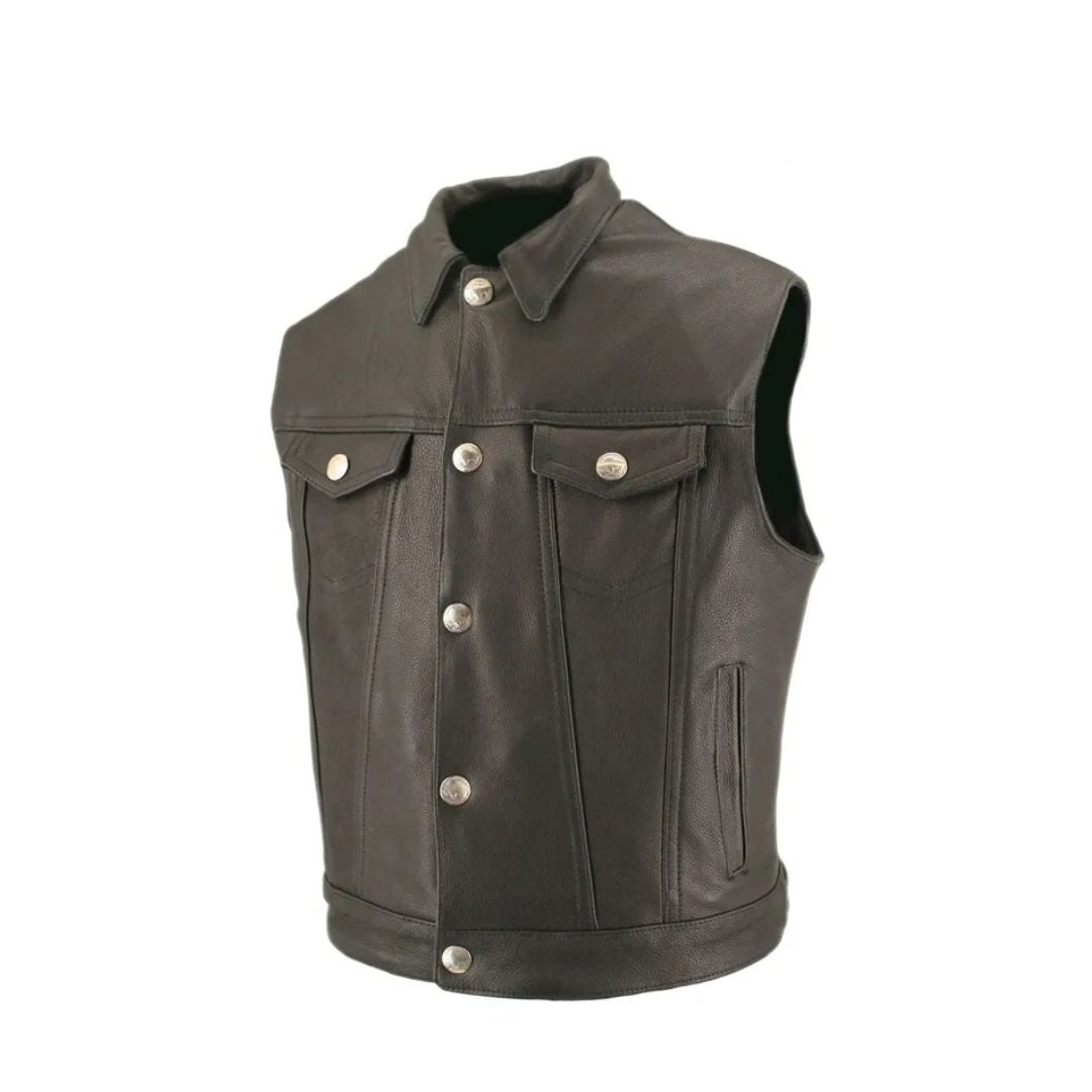 Men's Denim Style Vest With Collar. Classic high end looks combined with great comfort and value. Multi-panel stitched design, Genuine Bison Nickel throughout. 1.4-1.6mm (3 1/2- 4oz) Soft, Supple Cowhide Naked Leather, and with our standard features: Double sided leather interfacing enables the vest to retain shape when carrying a concealed pistol or any heavy objects. Two leather-lined front pockets ,two leather lined hand-warmer pockets and two inside leather lined pistol pockets (approx. 9 deep) close with a snap on one side and the other with a zipper, both have a small internal pocket (4 x 4) for a gun barrel or cell phone. Poly Twill extremely durable liner. A show piece that will never go out of style. Denim Style Biker's Vest With Collar. Lifetime Guarantee.