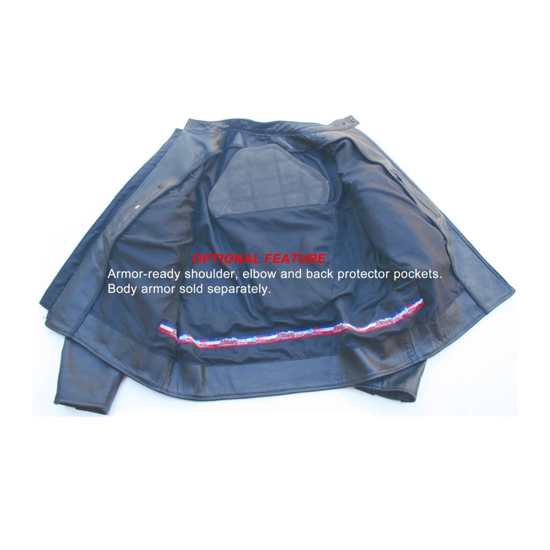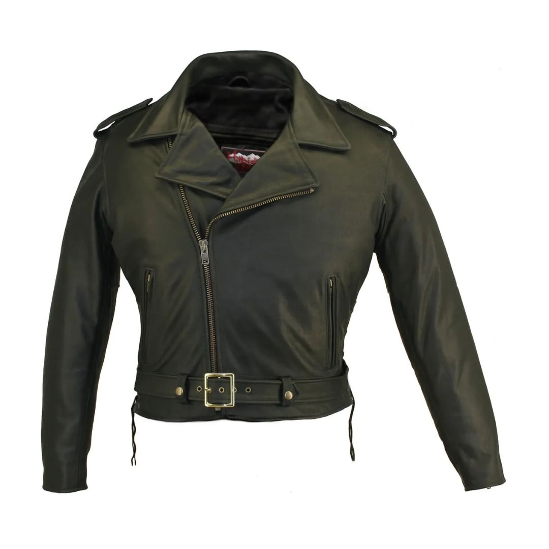 Men's Full Belted Biker Jacket. No bells, no whistles, just top quality leather designed in the classic biker image. This Jacket is loaded with riding features starting with an unique 1.6-1.8 mm (4-4 1/2 oz.) soft, supple, and thick Cowhide Naked Leather and the craftsmanship that only USA can offer. removable Thinsulate liner, two hand warmer pockets are Leather-Lined, two inside Leather-Lined Pistol Pockets (approx. 9 deep) close with a snap on one side and the other with a zipper, both have a small internal pocket (4 x 4) for a gun barrel or cell phone. Men's Full Belted Motorcycle Jacket. Heavy poly twill shell, an extremely durable linnig.YKK antique brass hardware, hidden snaps that makes it simple, yet functional design. In addition this jacket offers Bi-Swing Back and vented underarm gussets for comfort and range of movement, with side and belt adjustments to assure right fit for years of comfort and protection. Optional Feature: Armor-Men's shoulder, elbow and back protector pockets. Body armor sold separately.The built-in kidney panel makes it a great riding jacket.