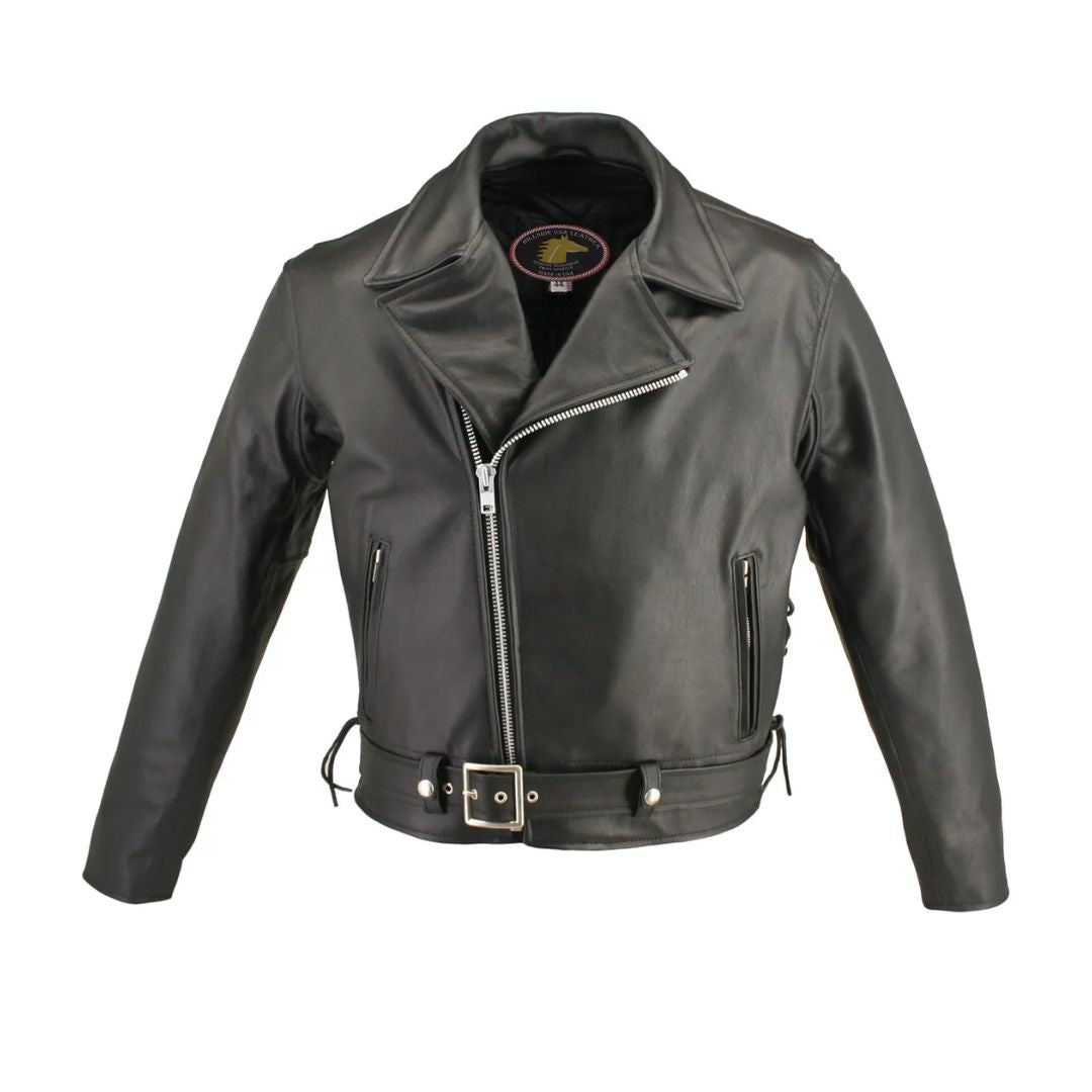 Men's Full Belted Horsehide M/C Jacket. A remarkable classic in Genuine Horsehide with every original detail. Horsehide has many unique properties, it is immensely strong and durable even in the extreme conditions, unlike other hides, and horsehide is naturally waterproof. Men's Belted Horsehide Biker Jacket. This Jacket is loaded with riding features starting with an unique 1.2-1.4mm Front Quarter Horsehide and the craftsmanship that only USA can offer removable Full Sleeve Thinsulate Zip Out Liner with knitted cuffs, two Hand warmer pockets are leather-lined, two inside Pistol Pockets (approx. 9 deep) close with a snap on one side and the other with a zipper, both have a small internal pocket (4 x 4) for a gun barrel or cell phone, Heavy Poly Twill shell, an extremely durable lining.YKK silver hardware, hidden snaps that makes it simple, yet functional design. Men's Full Belted Horsehide Motorcycle Jacket. In addition this jacket offers Bi-Swing Back and Vented Underarm Gussets for comfort and range of movement, with side and belt adjustments to assure right fit for years of comfort and protection, the built-in kidney panel makes it a great riding jacket and Proudly Made in the USA. Lifetime Guarantee.