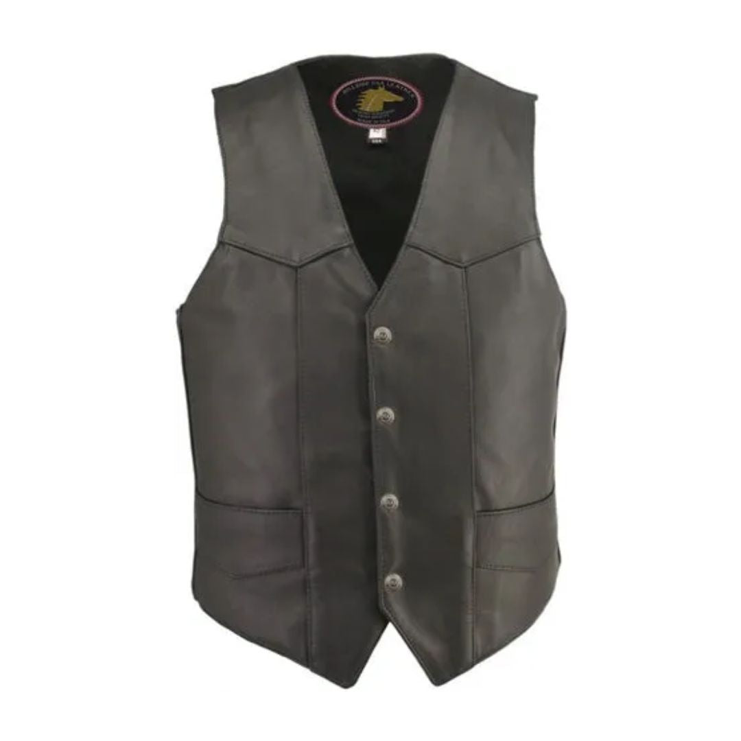 Men's Basic Biker Vest. There's is nothing basic about this vest, updated in 100% Front Quarter horsehide leather, and with our standard features: Double sided leather interfacing, enables the vest to retain shape when carrying a concealed pistol or any heavy objects. Classic Vest. Two leather-lined front pockets (approx. 4.5 deep) and two inside leather lined pistol pockets (approx. 9 deep) close with a snap on one side and the other with a zipper, both have a small internal pocket (4 x 4) for a gun barrel or cell phone. Antique Brass Hardware, Denier Cordura 1000 liner. Our leather motorcycle vests are designed for comfort and durability along with our Lifetime Guarantee.