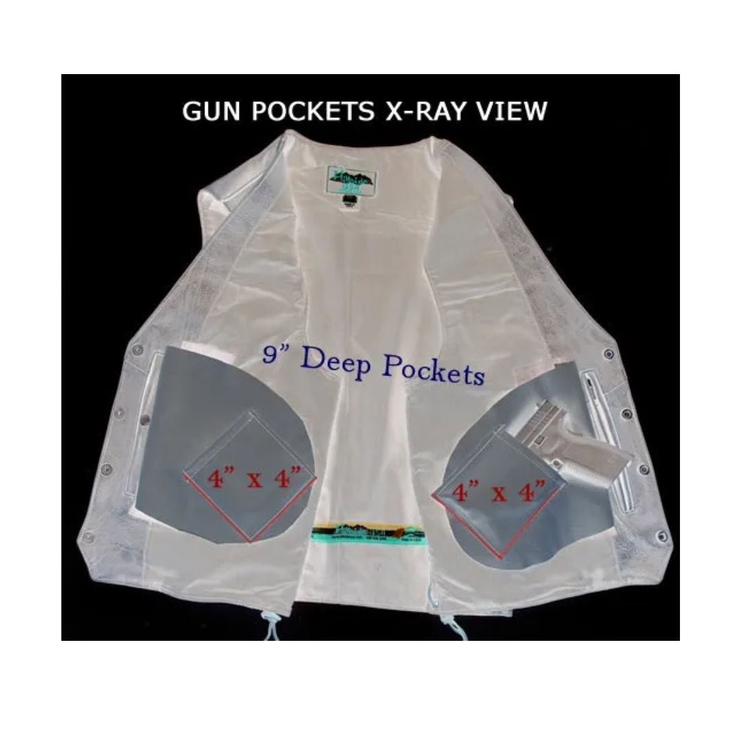 Men's Laced Side Classic Biker Vest with Gun Pockets. A supple, yet sturdy softness emanates from this vest, hand-crafted with 1.4-1.6 mm (3 1/2-4 oz.) Soft, Supple Cowhide Naked Leather, and with our standard features: Double sided leather interfacing, enables the vest to retain shape when carrying a concealed pistol or any heavy objects. Two Leather-Lined front pockets (approx. 4.5 deep) and two inside Two Leather-Lined pistol pockets (approx. 9 deep) close with a snap on one side and the other with a zipper, both have a small internal pocket (4 x 4) for a gun barrel or cell phone . Antique Brass Hardware, Poly Twill extremely durable liner. An excellent stitch-work enhances the USA's collection in such a way to provide timeless look along a perfect fit. Laced Side Classic Motorcycle Vest Lifetime Guarantee.