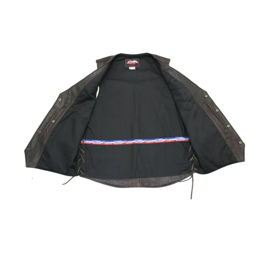 The Solid Back Distressed Brown Vest invites you to have the ride of your life-for a lifetime. Hand made and stitched in the USA represents the best that motorcycle apparel industry can offer. Double sided leather interfacing, enables the vest to retain shape when carrying a concealed pistol or any heavy objects.Two Leather-Lined front pockets (approx. 4.5 deep) and two inside Leather-Lined pistol pockets (approx. 9 deep) close with a snap on one side and the other with a zipper, both have a small internal pocket (4 x 4) for a gun barrel or cell phone . Adjustable lace-up for just the right fit.Genuine Indian Head Nickel. Poly-twill liner. The detailed construction gives this vest a timeless feel with a flash of Old World meets something fresh and new. Men's Solid Back Distressed Brown Motorcycle Vest. Lifetime Guarantee.