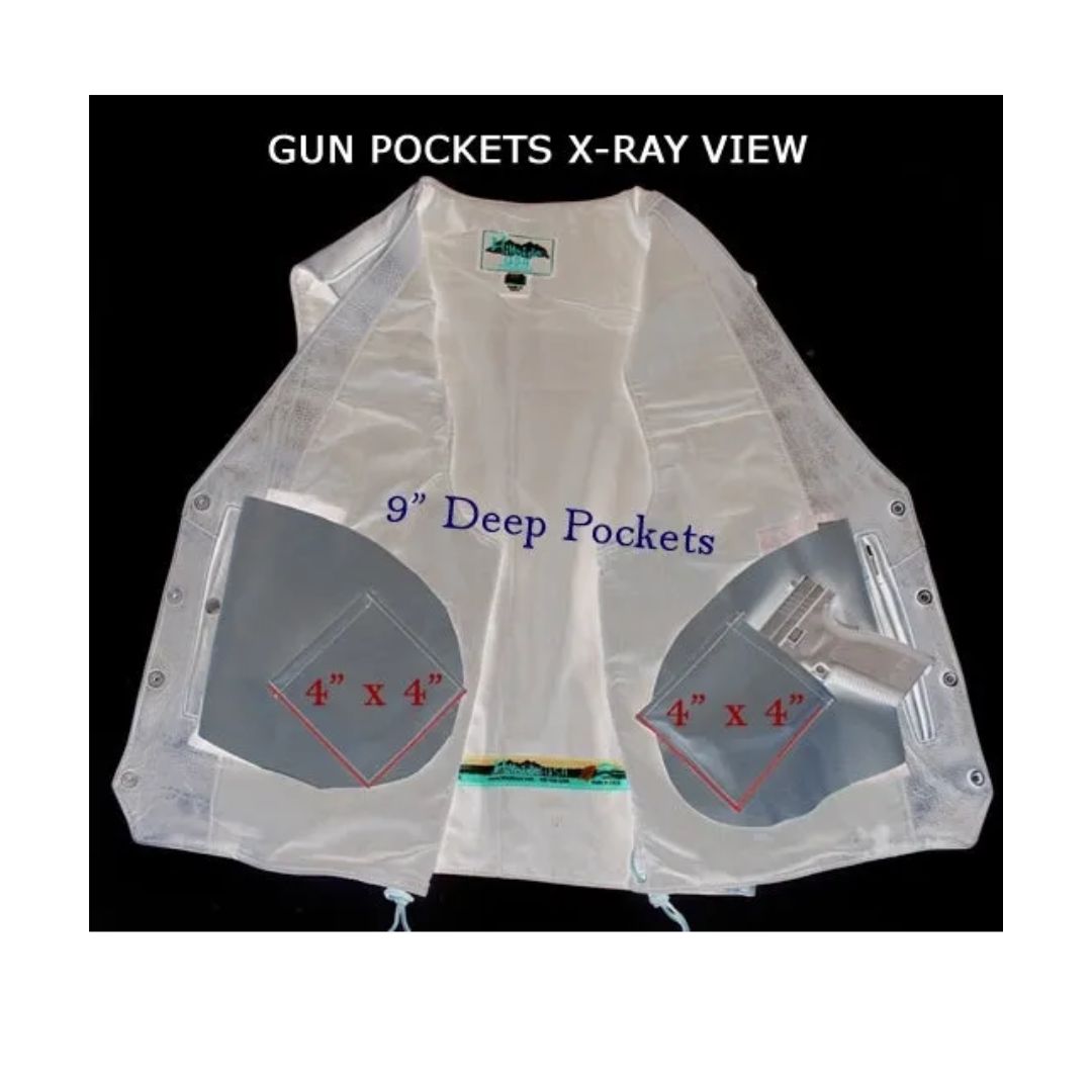 - Two internal leather lined pistol pockets (approx. 9" deep) one zippered and the other snapped.