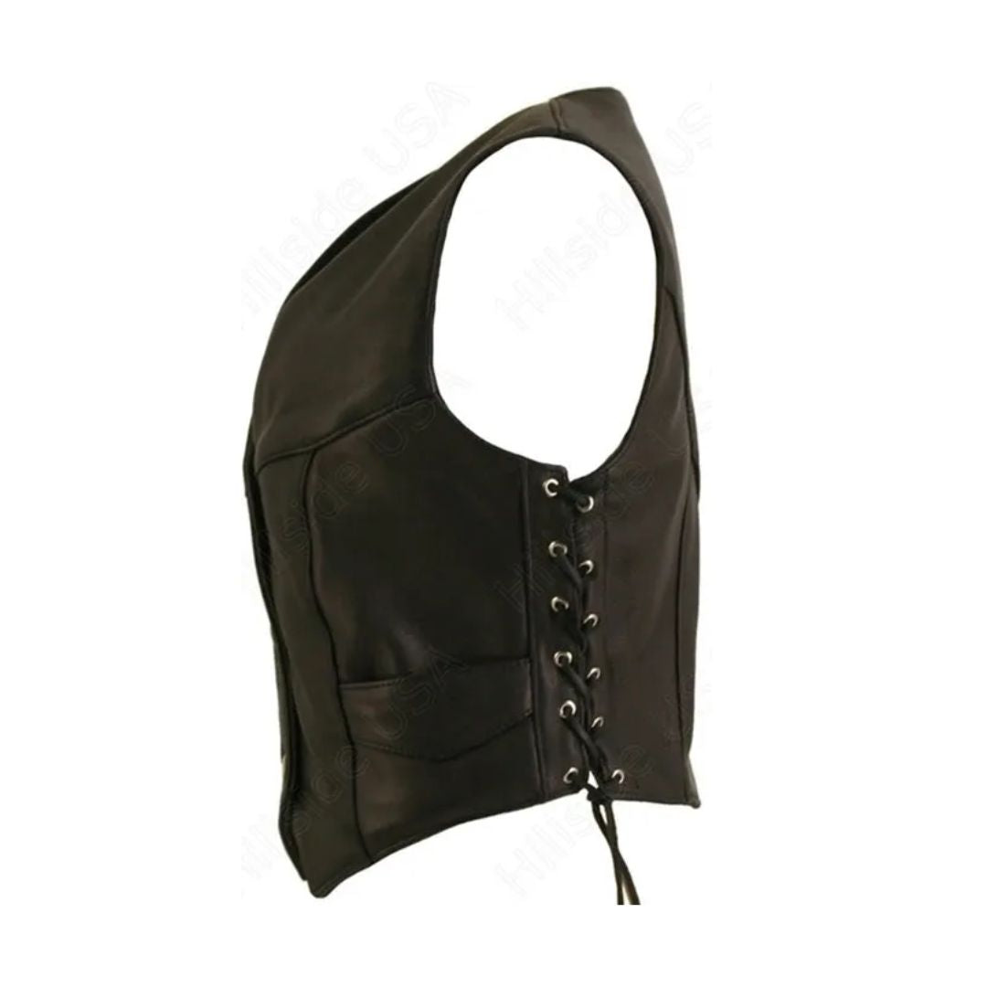 The Biker Laced Vest is a perfect example of why USA is your premier online leather apparel store. True luxury, true style. Luxurious hand finished leather complements perfect design and stitching. 1.2-1.4mm (3-3 1/2 oz) Soft, Supple Cowhide Naked Leather, and lace sides. Two external cordura lined pockets, two zippered inside cordura lined pockets. Poly Twill an extremely durable liner. Ladies laced Motorcycle Vest. Lifetime Guarantee.