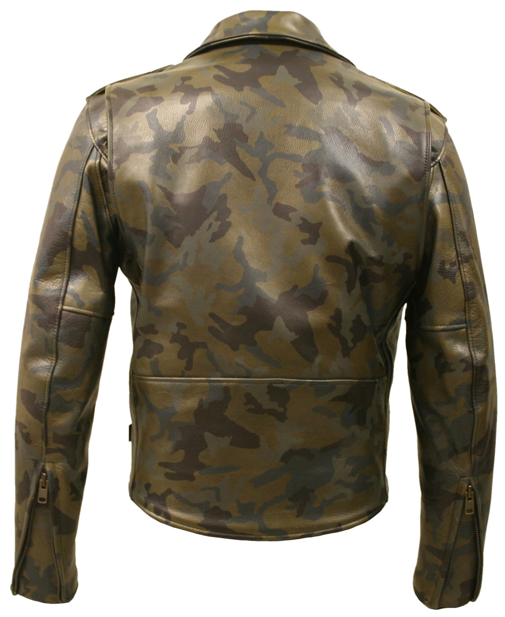 Hillside USA Camouflage All Leather Biker Jacket is a celebration of classic military attire. This crafted jacket is composed of a 1.2- 1.4 full grain cowhide camouflage Leather. Putting camo on leather is no easy task, heat and pressure is used to literally bond the camouflage pattern to the premium leather. The result is a permanent, abrasion resistant bond that will last the life of the product. Features: action back, zippered cuffs, three Cordura lined outside zippered pockets with snap-down collar two internal pistol pockets (approx. 9" deep) which close with a snap on one side and a zipper on the other. Lifetime Guarantee.